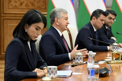 El presidente de Uzbekistán, Shavkat Mirziyóyev, y la jefa de su administración, Saida Mirziyóyeva, durante una reunión con Serguéi Kiriyenko. Foto del sitio President.uz