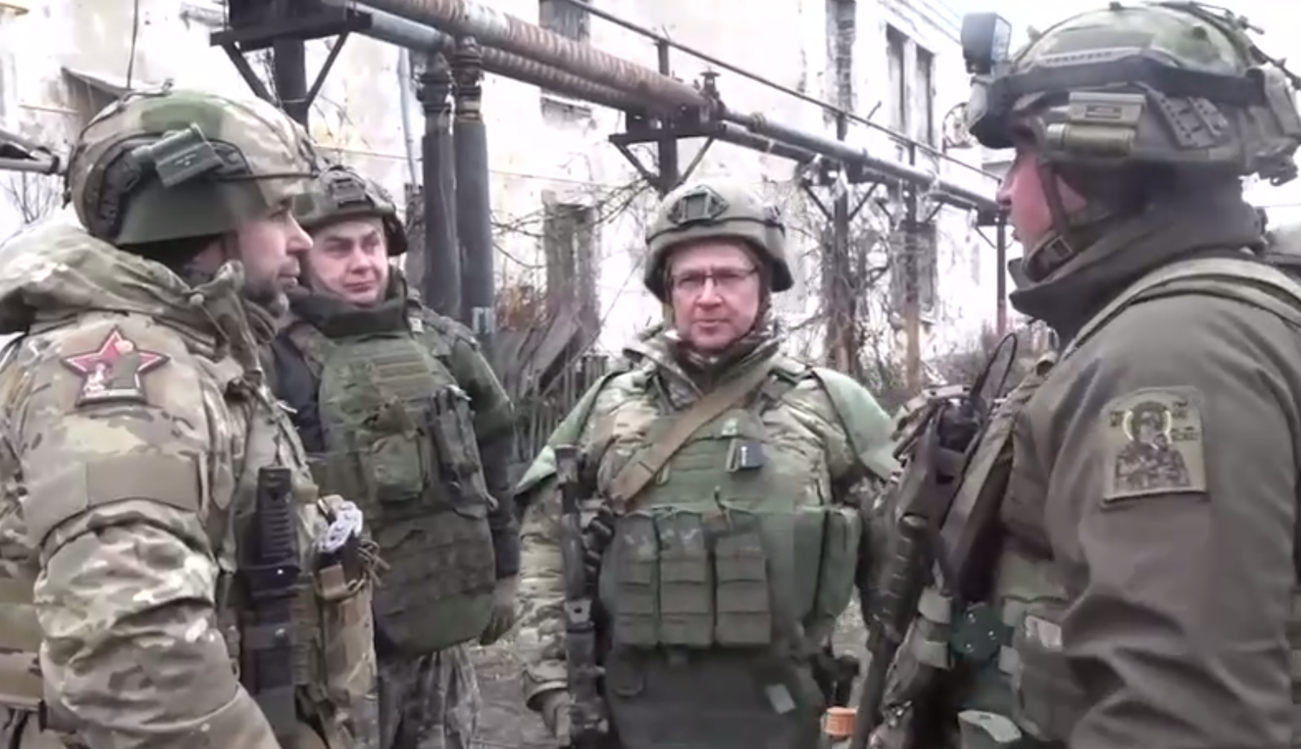 Serguéi Kiriyenko camina con un fusil por las calles de Mirnogrado —una ciudad del distrito de Pokrovsk, en la región de Donetsk, Ucrania—. Imagen de un video oficial, marzo de 2026.